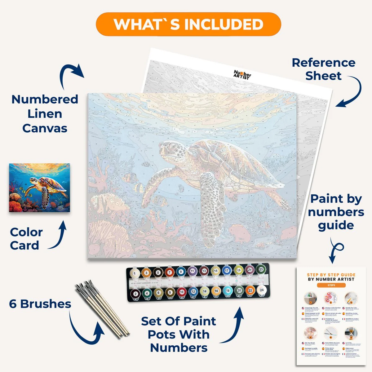 Unleash your inner artist and find peace with Coral Glide. Paint by numbers while meditating on a sea turtle gracefully gliding through a vibrant coral reef. Surround yourself with different types of coral fish and bring this undersea scene to life. Dive into relaxation with Coral Glide!