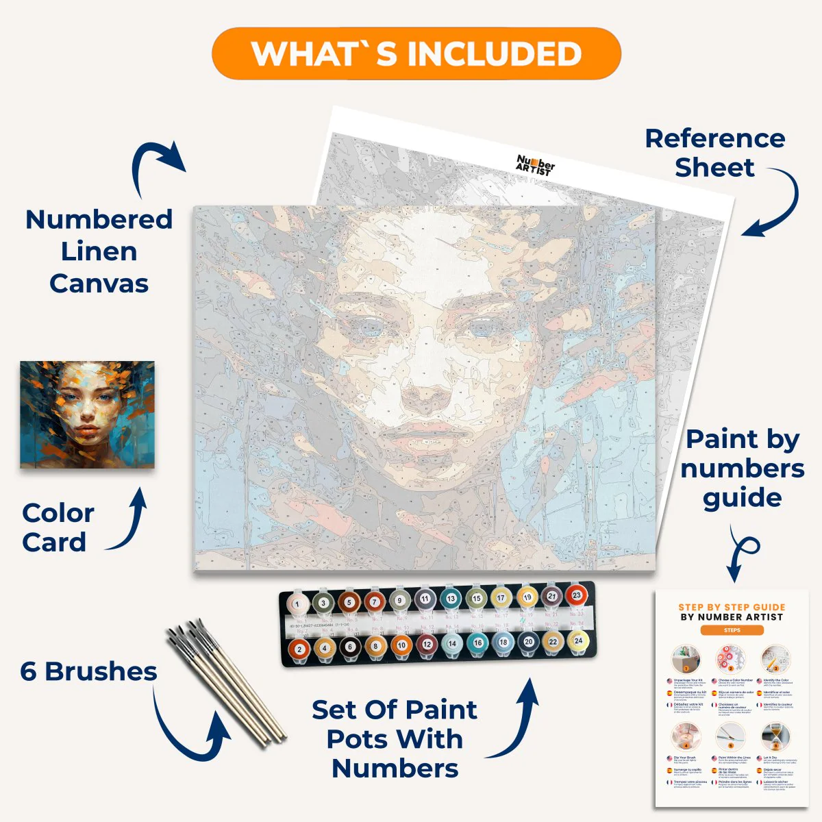 Unleash your creativity with Fragmented Beauty. Paint by numbers while meditating and let the beautiful woman with blue eyes on a turquoise blue background inspire you. Discover the harmony and beauty of art in a fun and relaxing way.