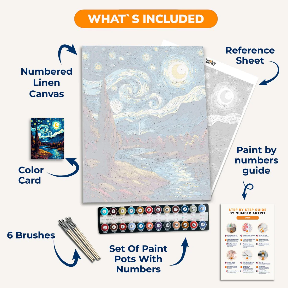 Get lost in the surreal beauty of the Night Swirl Over Nature painting. Paint by numbers while meditating on the calming night sky swirl, illuminating the mountain river and moonlit woods. Unleash your creativity with this unique, tranquil piece.