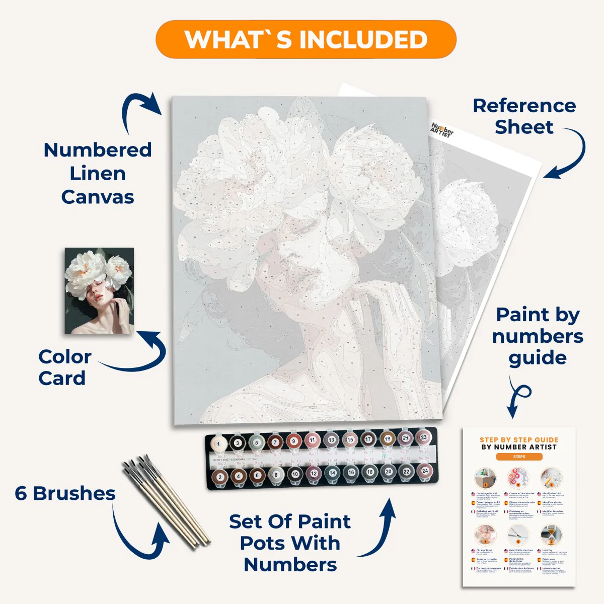 Unleash your inner artist with Snow White Petals. Paint by numbers while meditating and create a stunning portrait of a young woman surrounded by large, striking white flowers in her hair. Relax and let your creativity bloom!