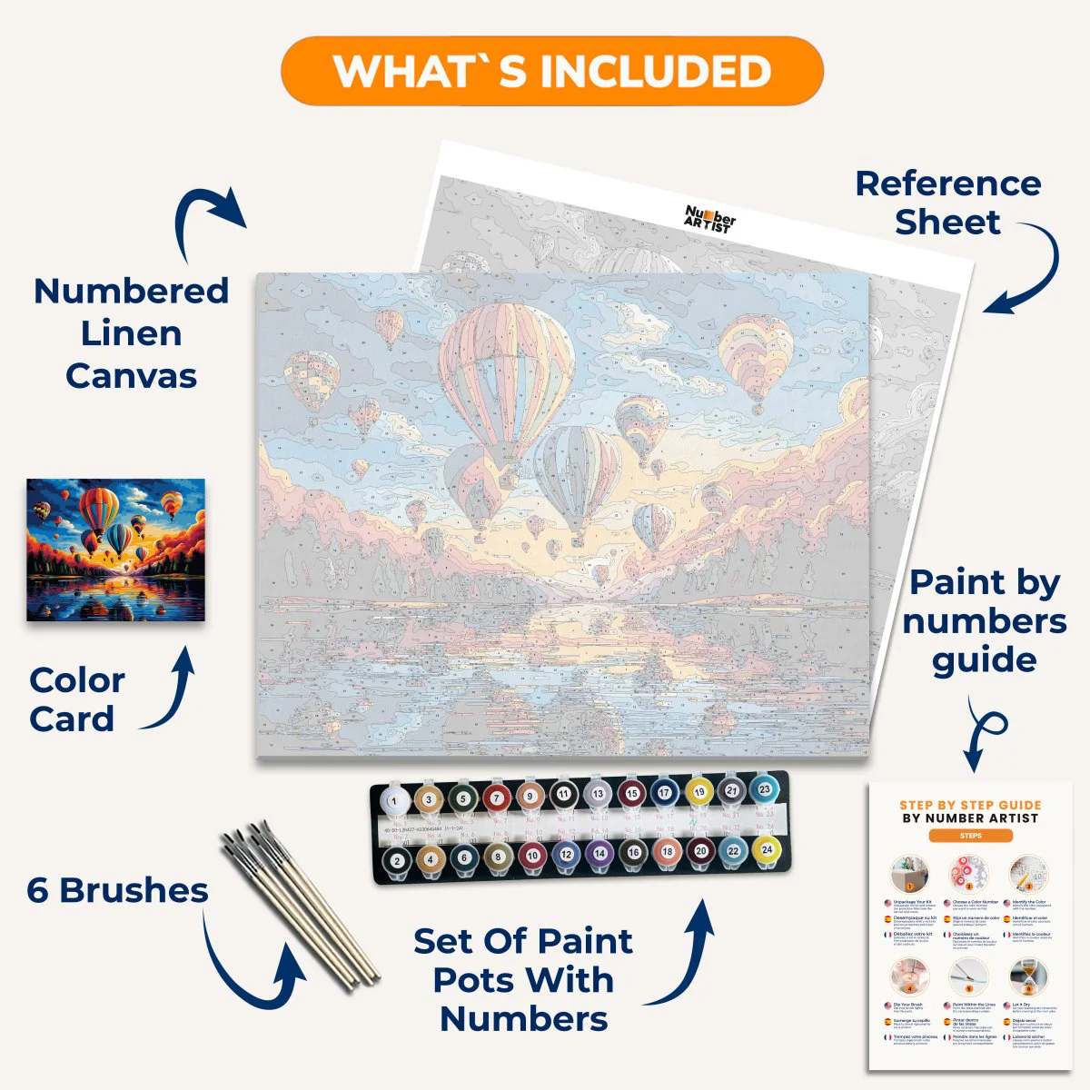 Paint a tranquil scene of flying balloons above a serene lake and lush woods with Sunset Ascension's paint by numbers kit. Let your mind unwind while creating a stunning sunset sky. Perfect for peaceful meditation, this kit adds a touch of whimsy to your painting experience.